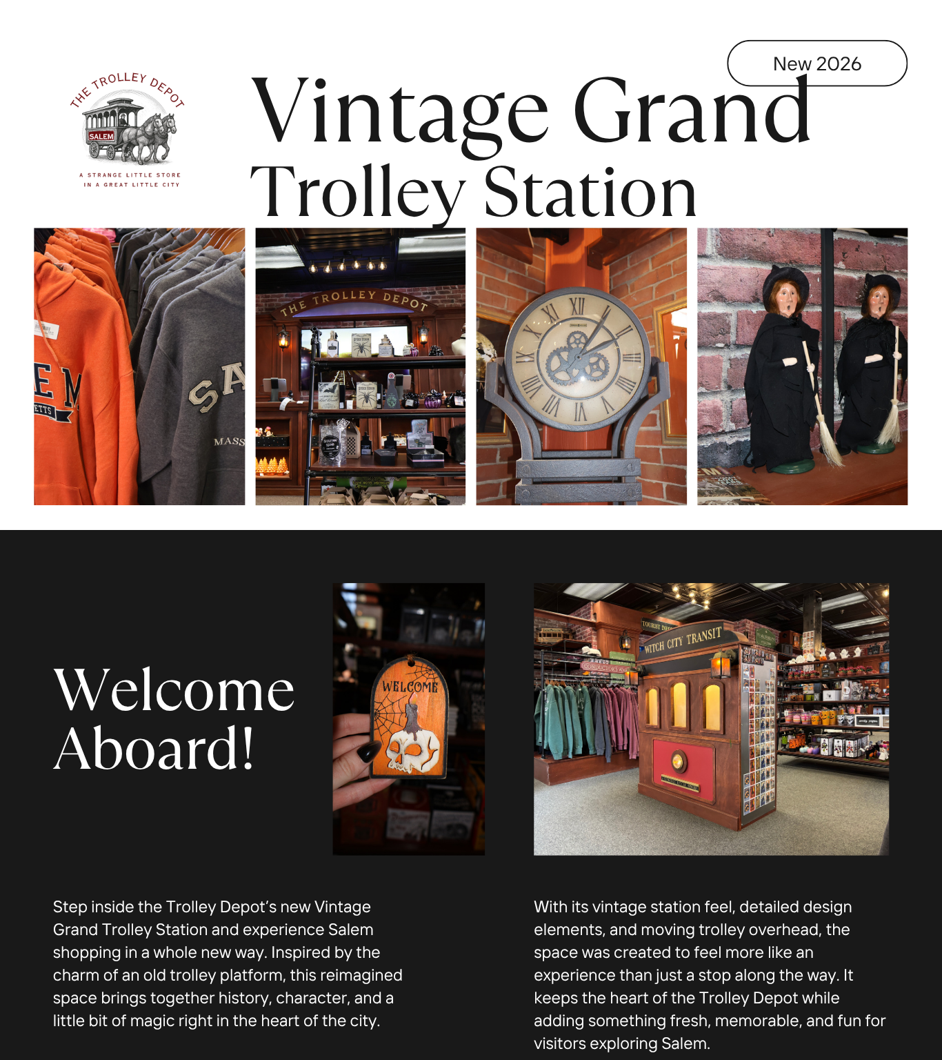Hop aboard the Salem Trolley for a fun and informative ride through historic Salem, MA! This narrated tour is the perfect way to explore the city's rich past and fascinating landmarks. You can buy your Salem Trolley tickets right at The Trolley Depot, conveniently located in the heart of downtown. While you're here, don’t forget to browse our selection of Salem-themed souvenirs—the perfect memento to remember your visit.