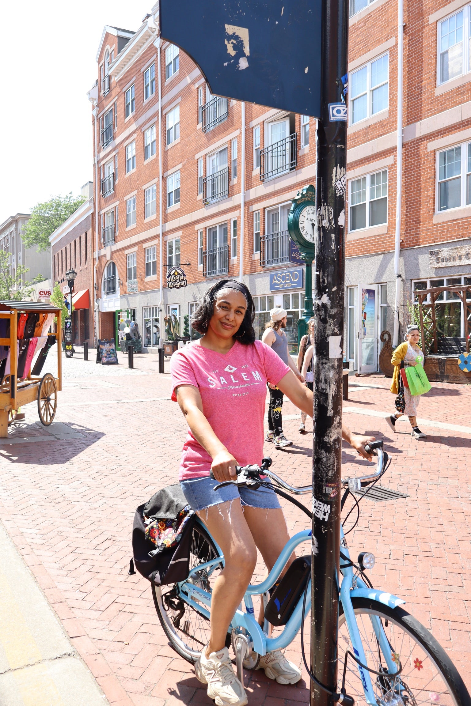 V-neck cotton poly blend tee in pink or blue with a small witch icon. Women's sizes Small - 2XL. Relaxed fit.
