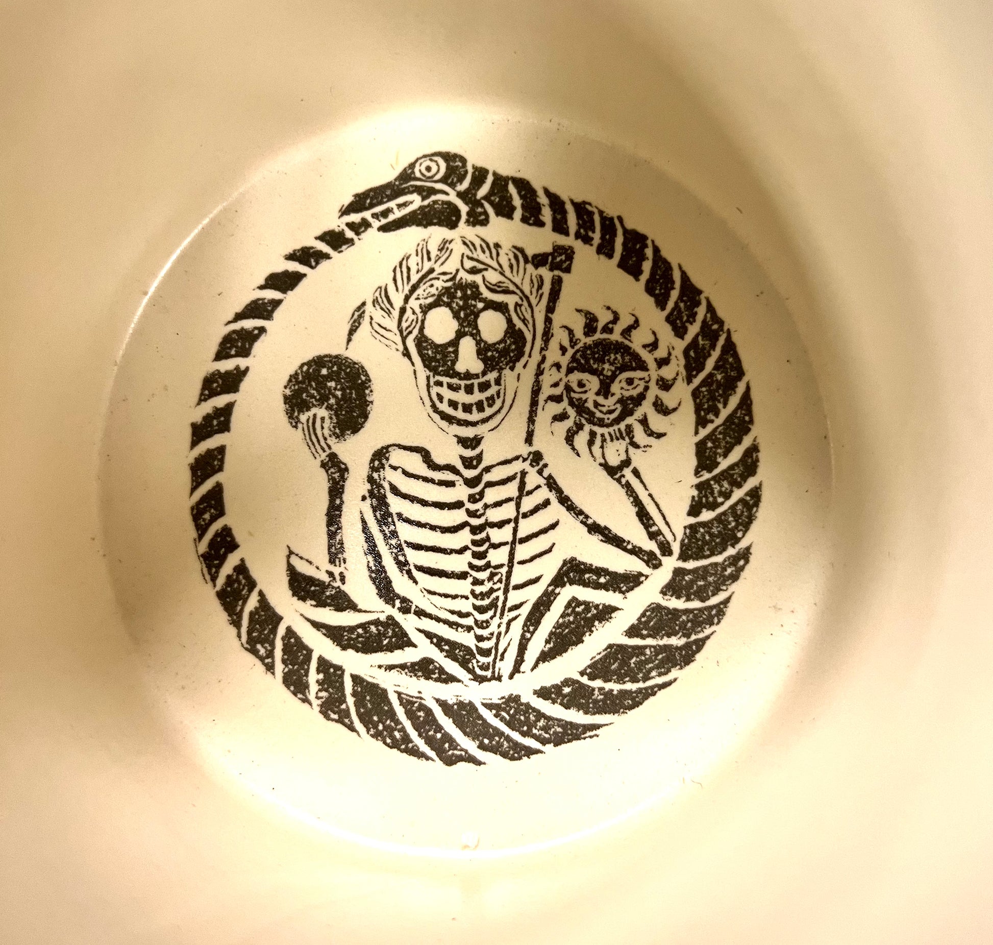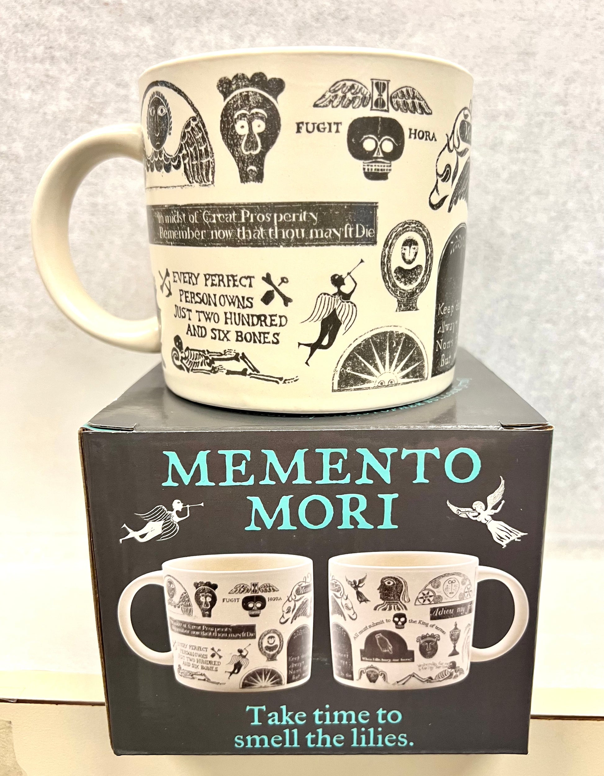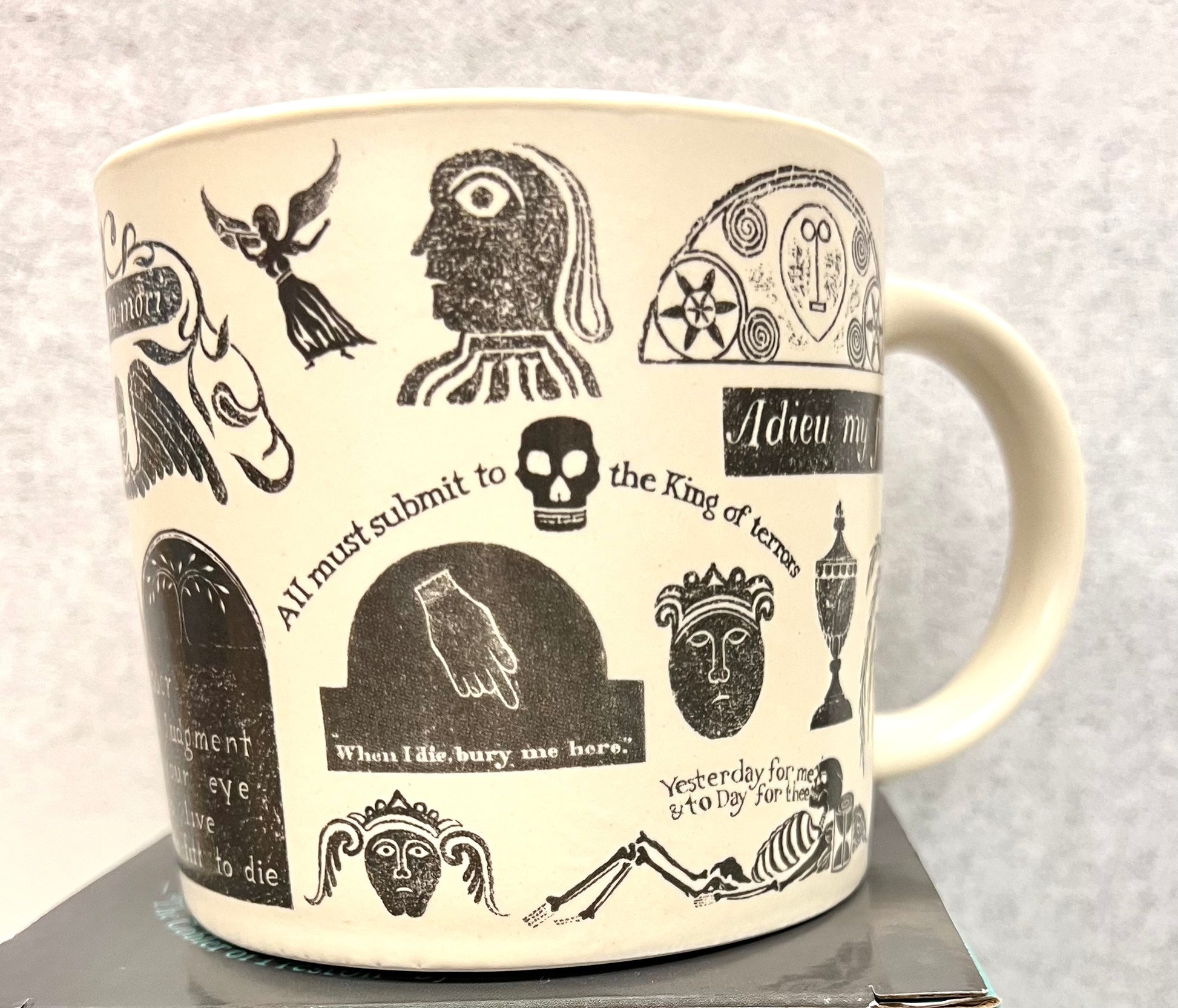 Off white mug is covered in images from early grave markers, headstones, and burial monuments. Inside the mug is a detail from my favorite New England headstone, Susanna Jayne (located in Marblehead, Massachusetts).