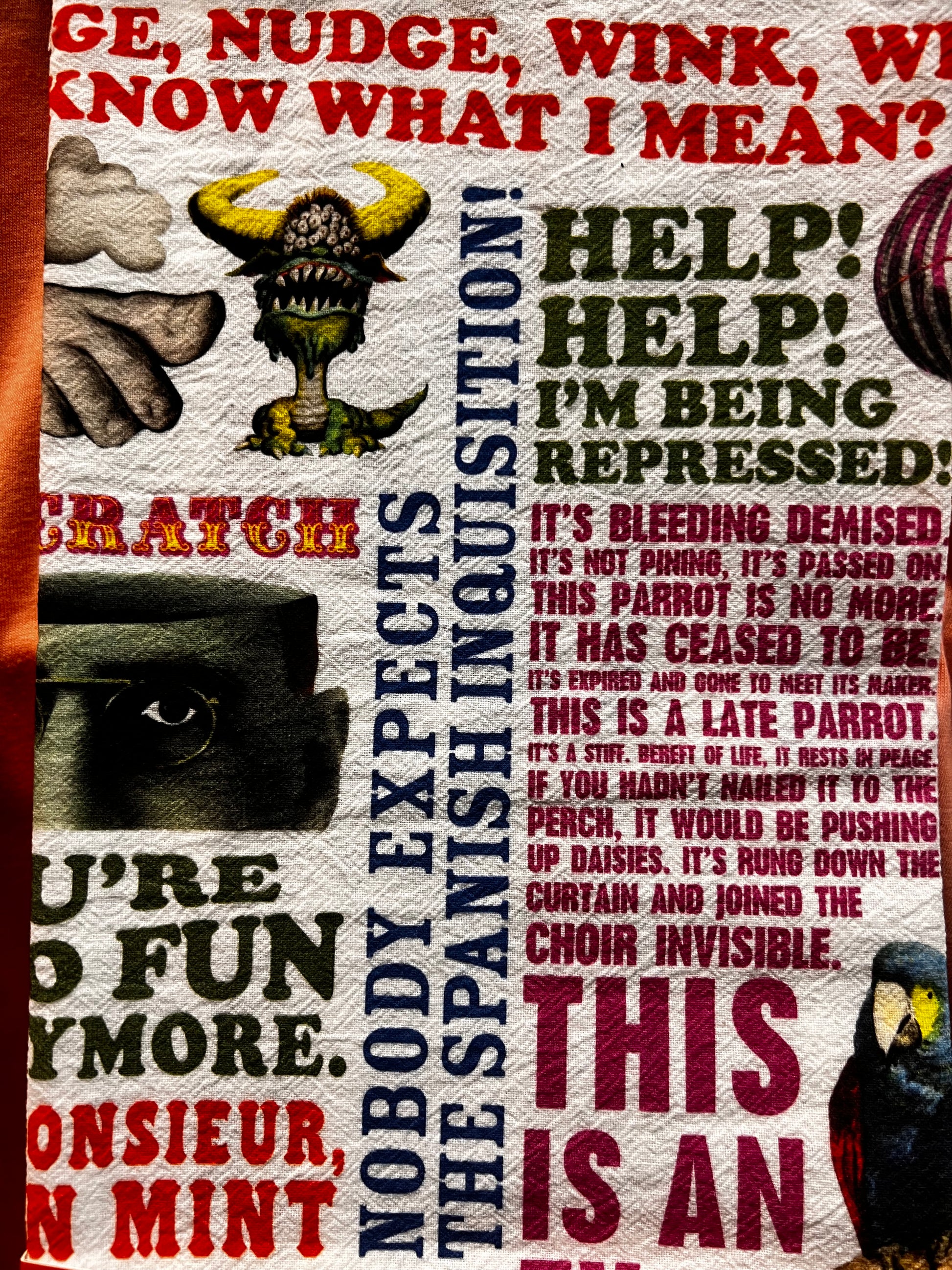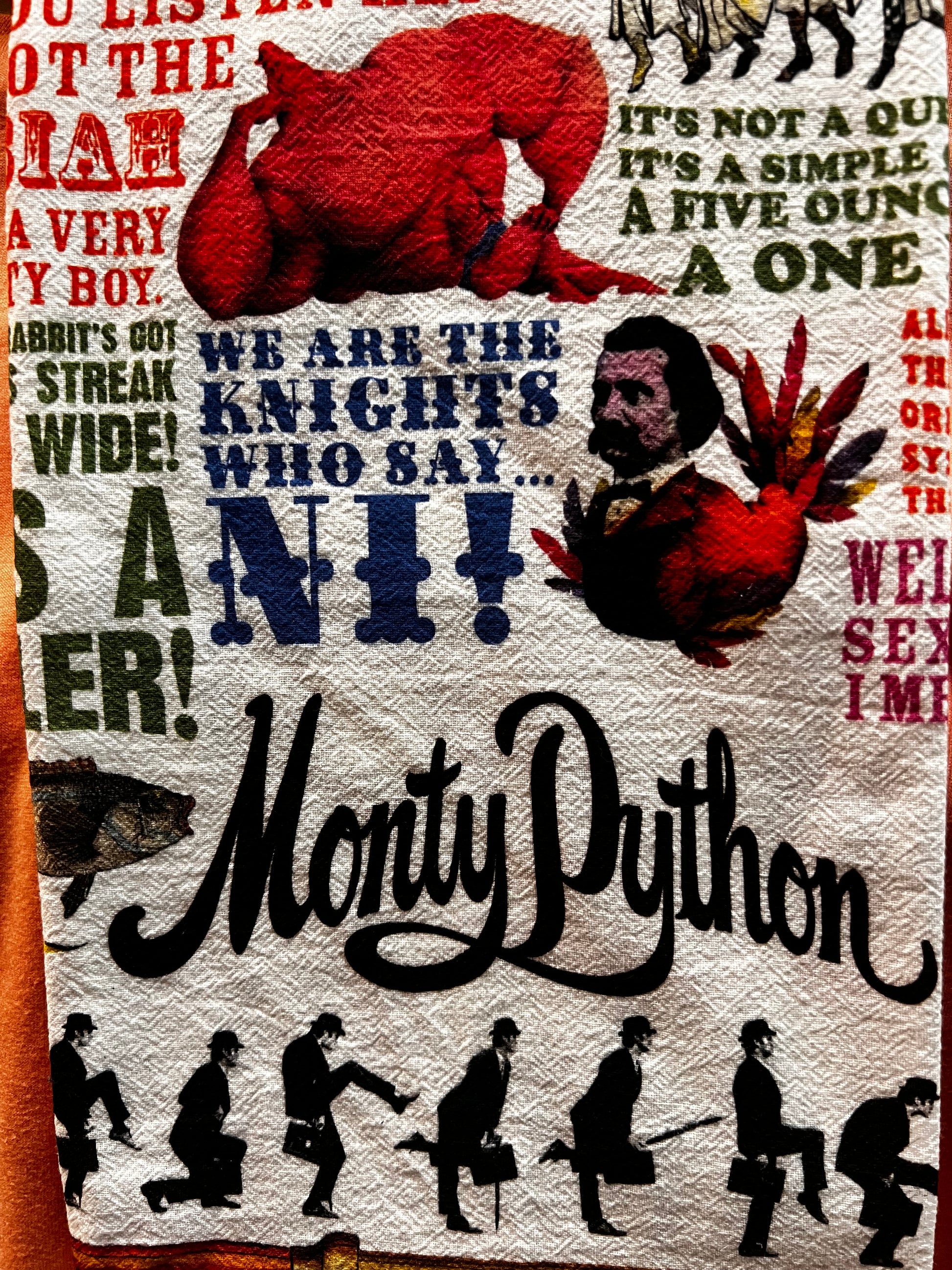 All of your favorite Monty Python quotes printed on a 100% cotton dish towel.
