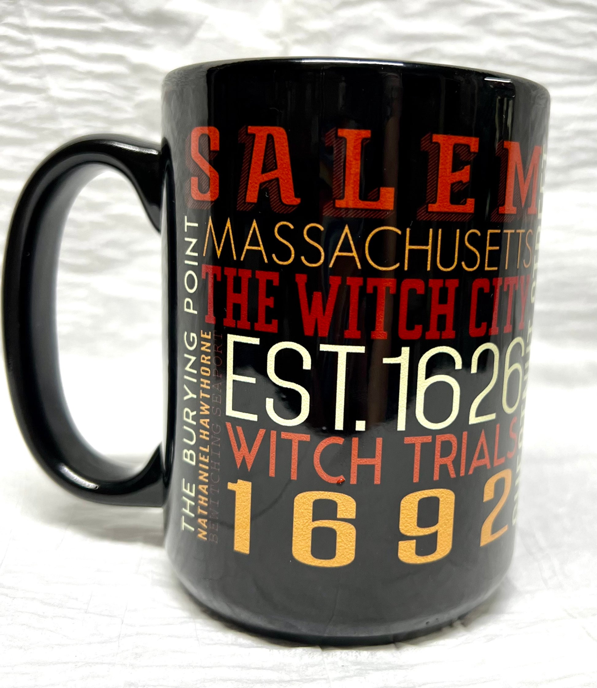Black mug with Salem themed words in a lovely fall palette. Dishwasher and microwave safe,
