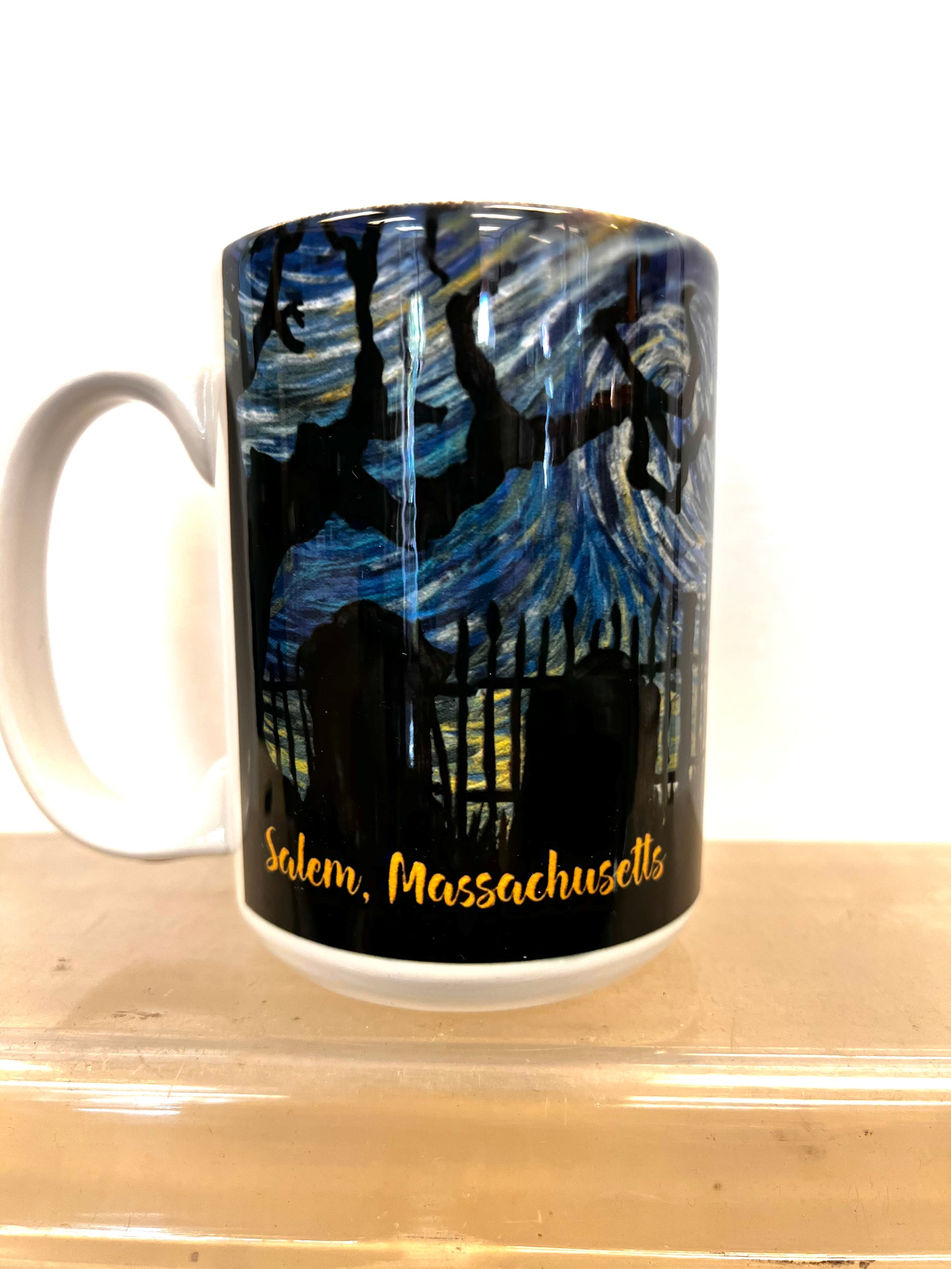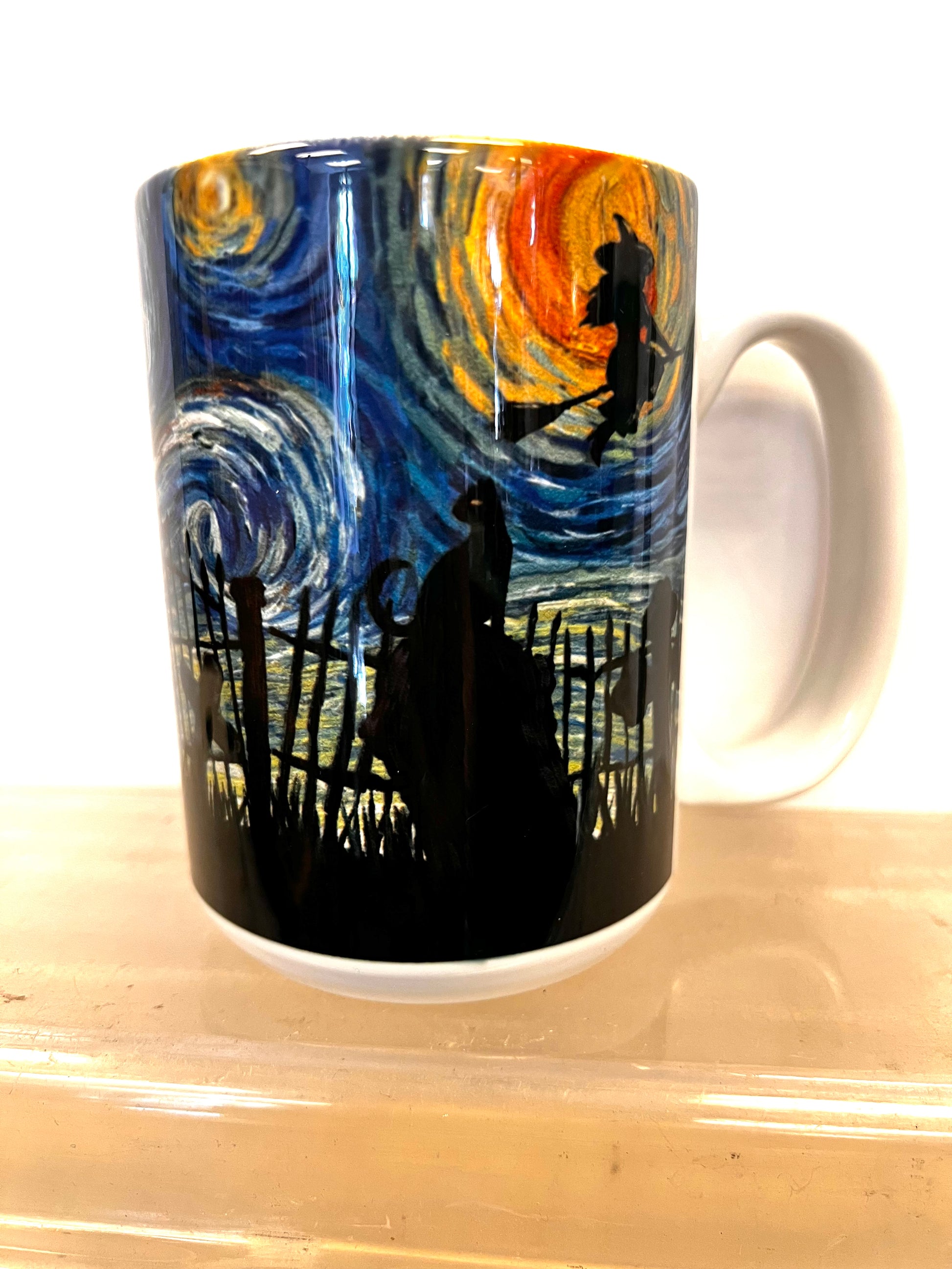 White ceramic mug with full color wrap around design in the style of Van Gogh's Starry Night.