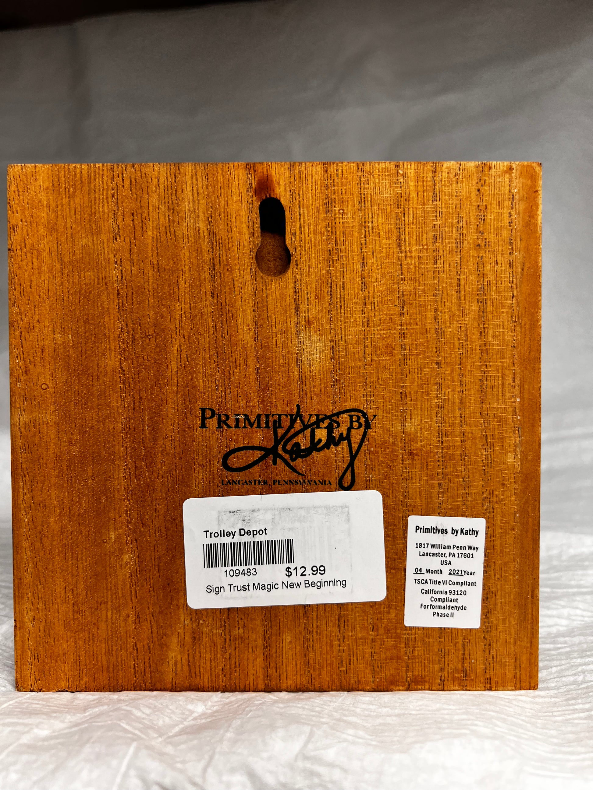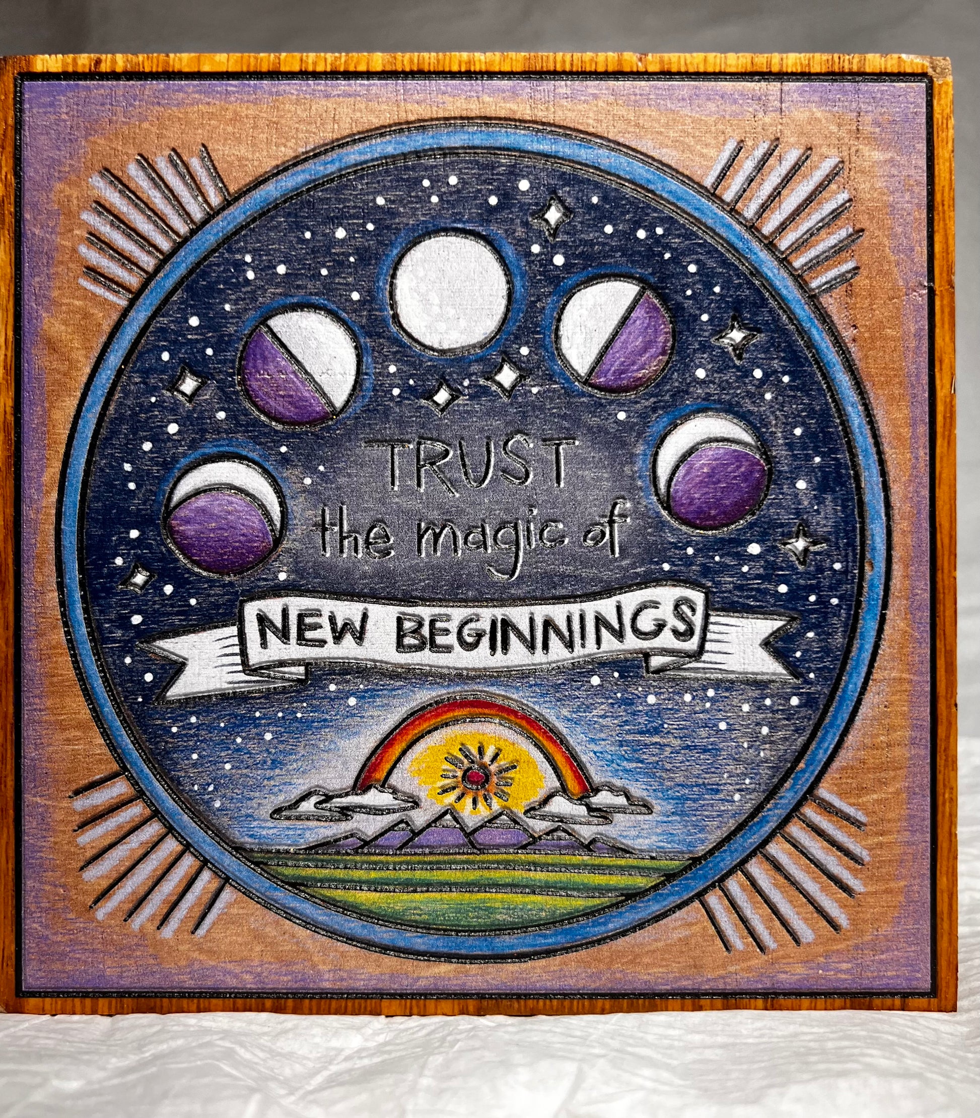 6" square wooden sign with moon phases and dawning sun. "trust the magic of new beginnings"
