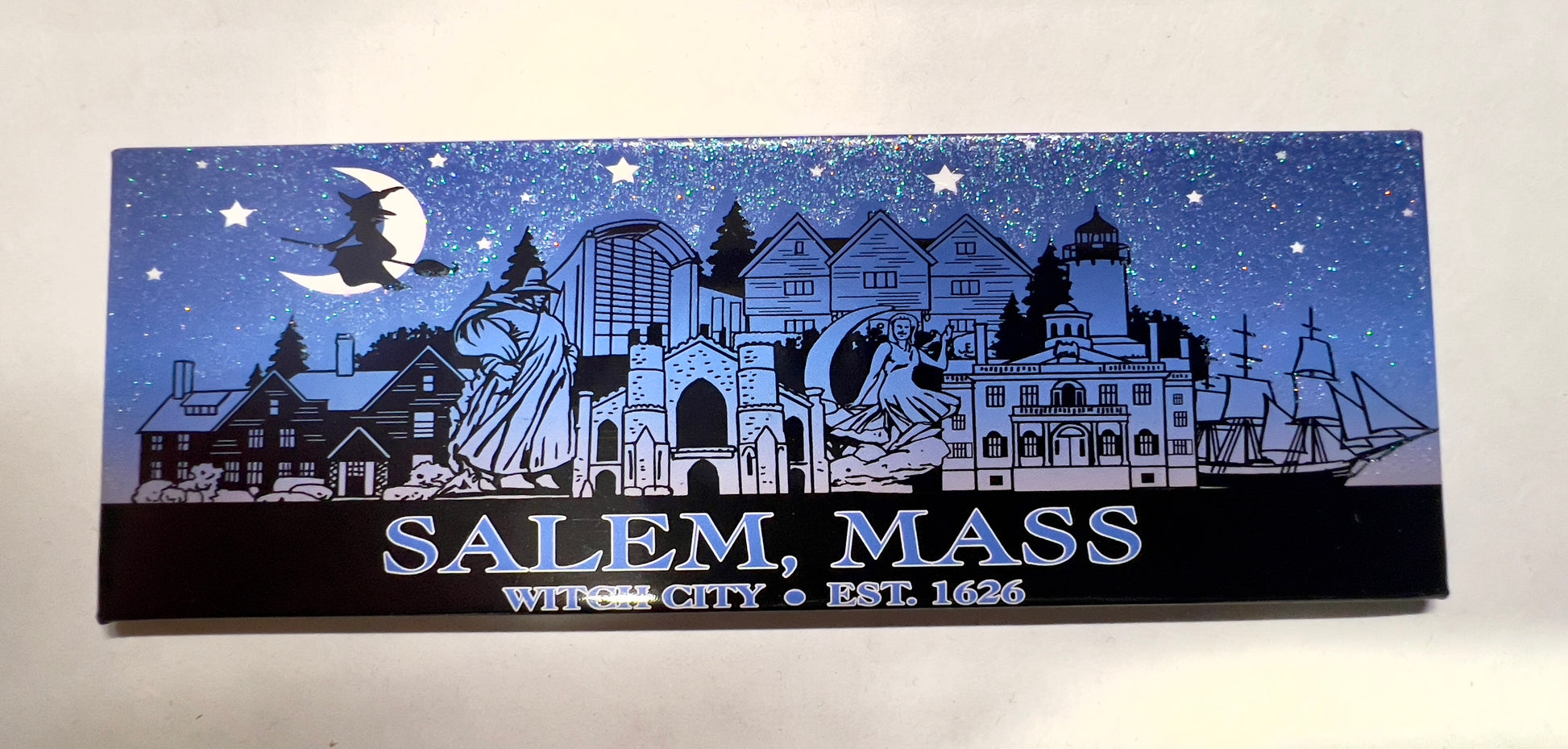 Blue and black magnet with scenes of Salem and a sparkly night sky. 5" wide.