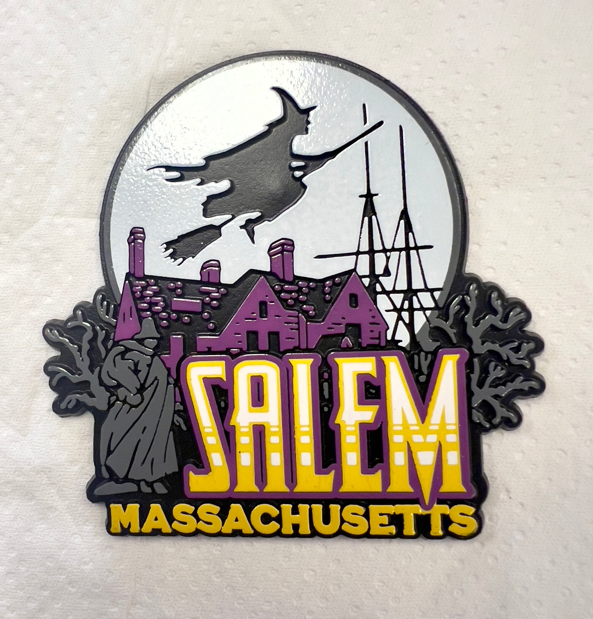 2 3/4" x 2 3/4" full color rubber magnet. Features a witch, Roger Conant (founder of Salem), a ship, and the House of 7 Gables.