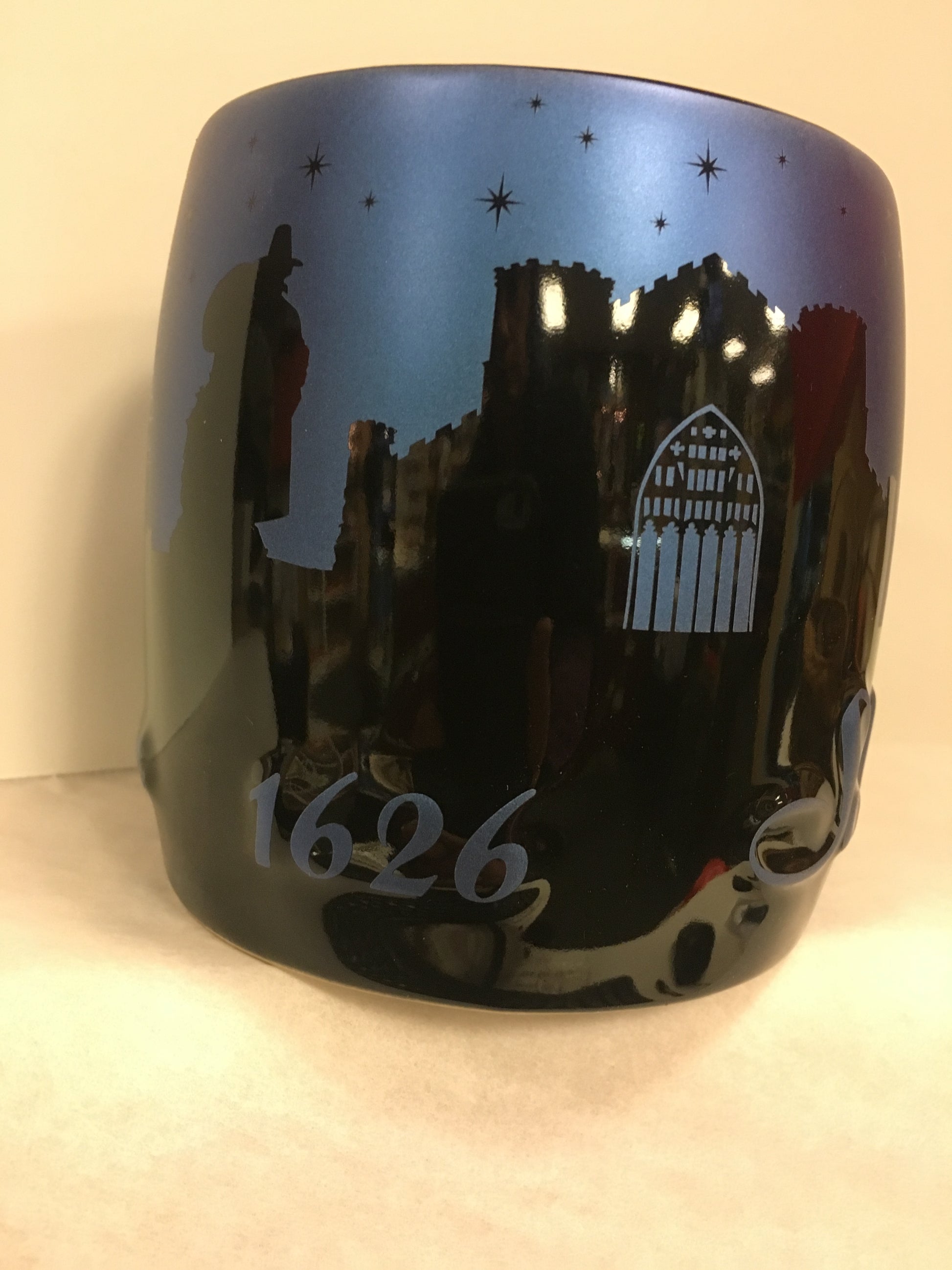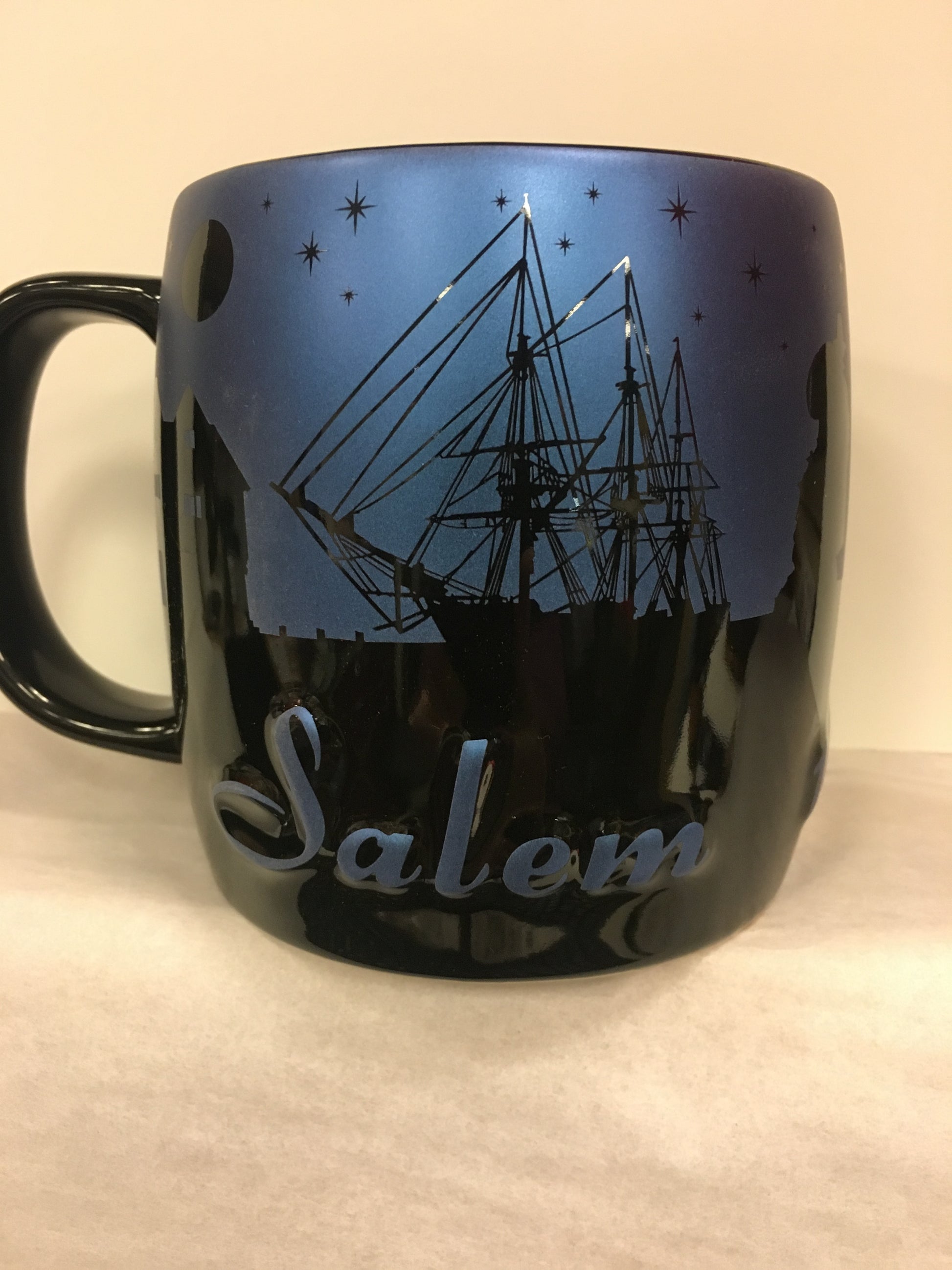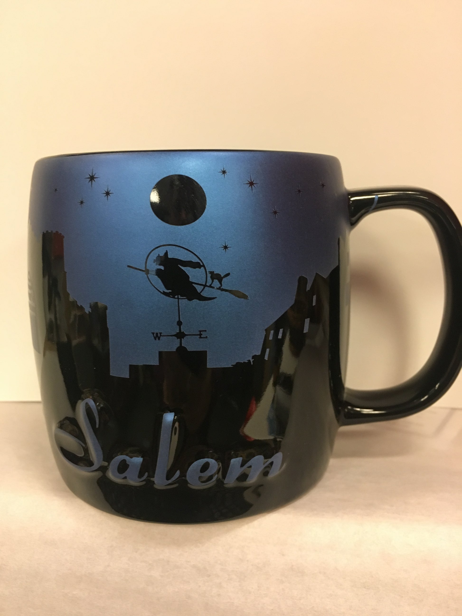 Big, beautiful mug with some of Salem's iconic landmarks in silhouette against a shimmering blue sky.