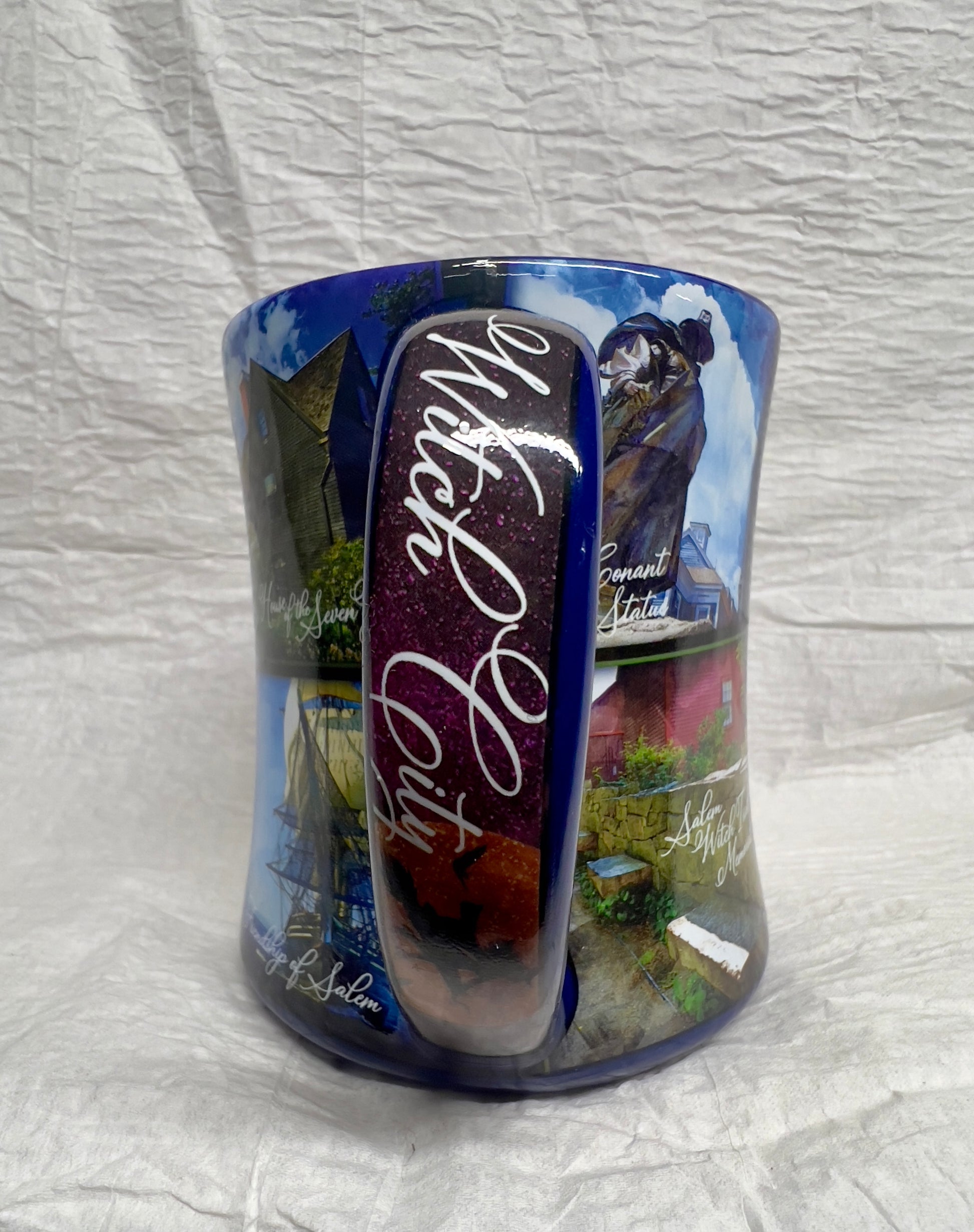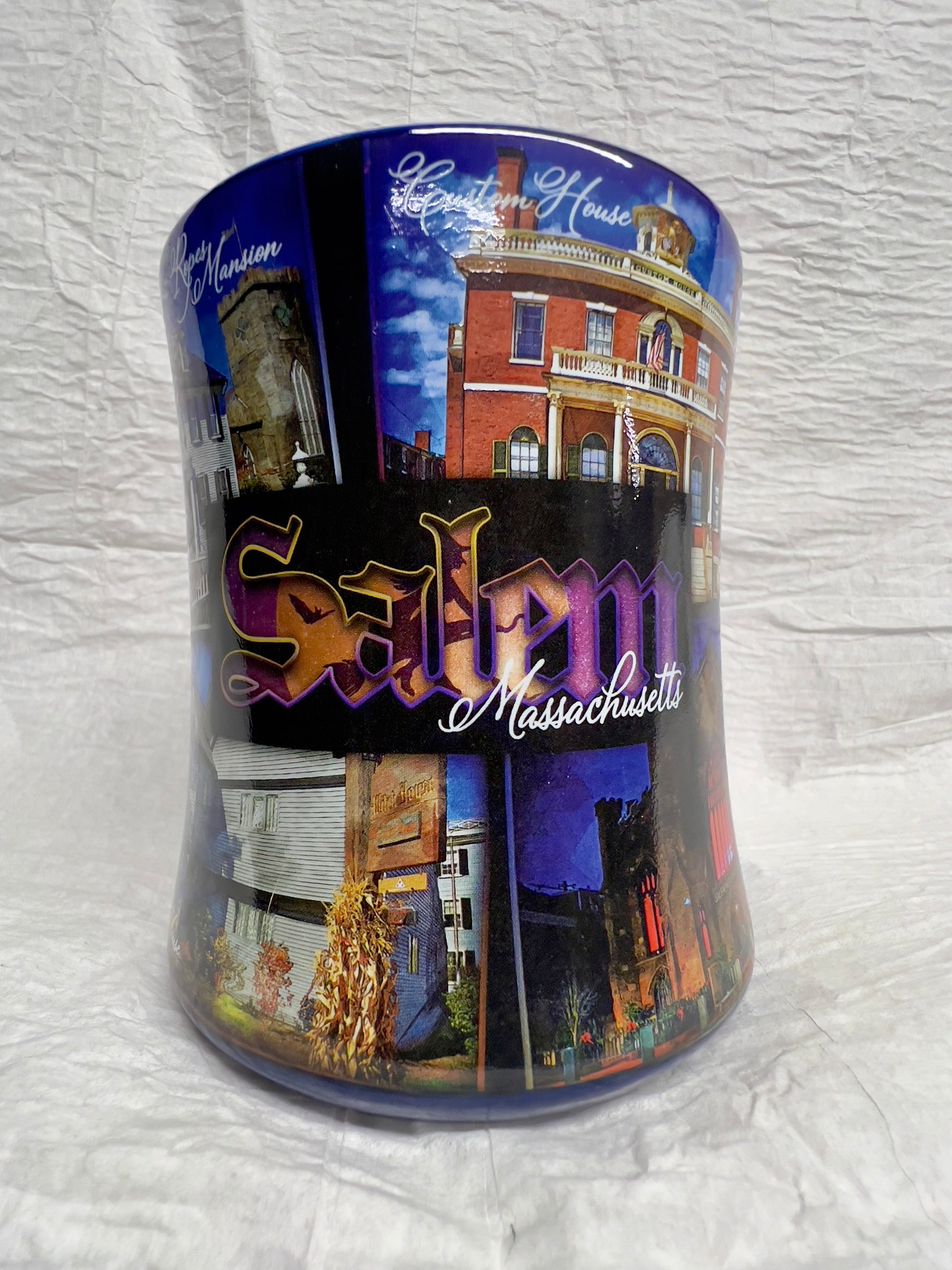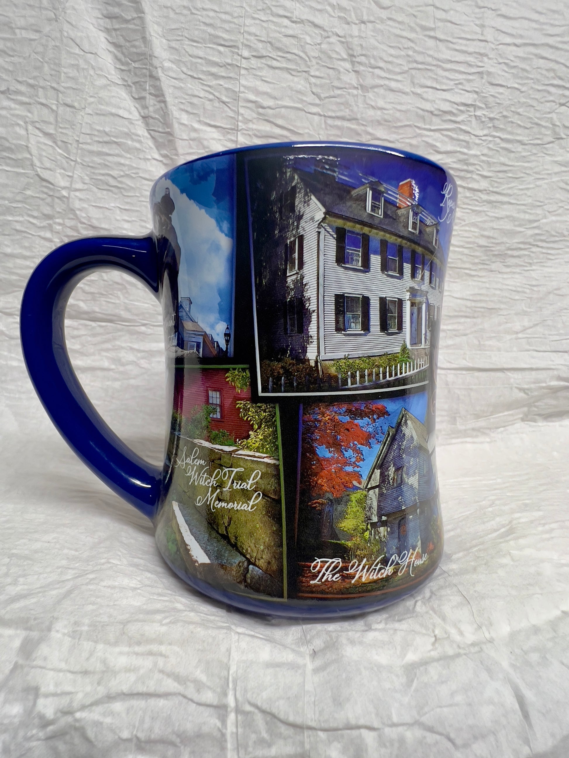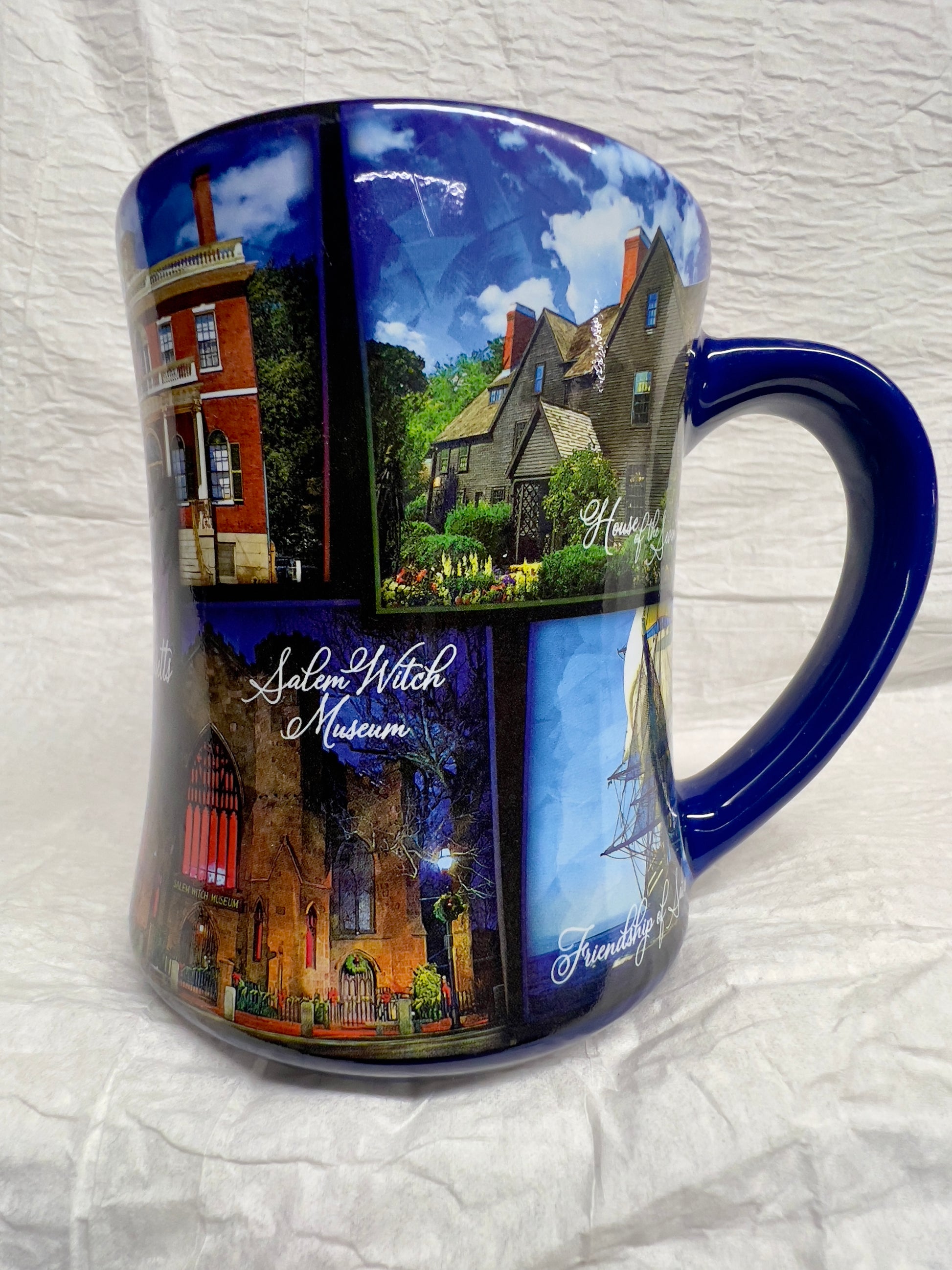 Cobalt blue mug covered with iconic Salem sites in full color. Mug is dishwasher and microwave safe and has that classic diner feel.
