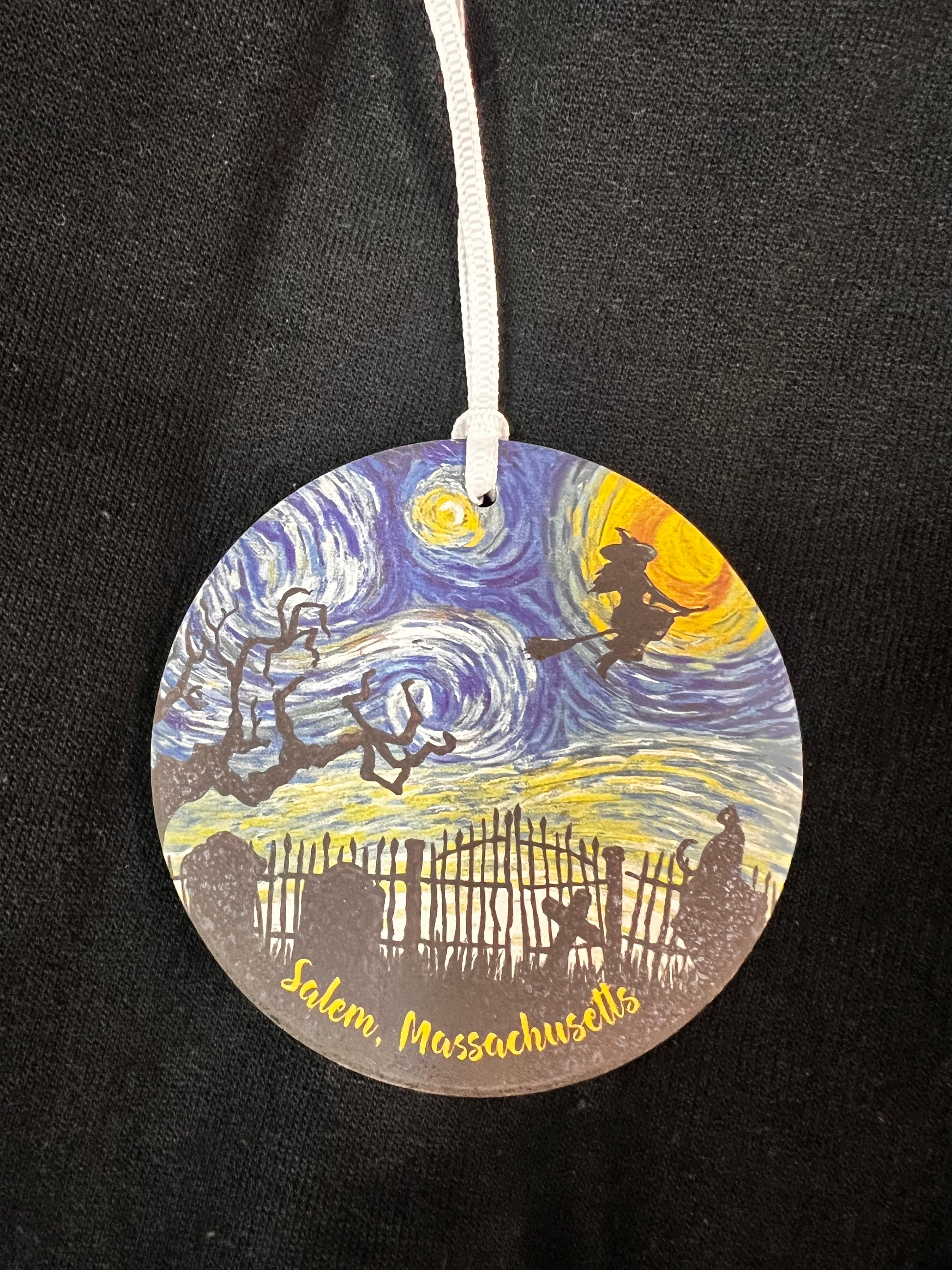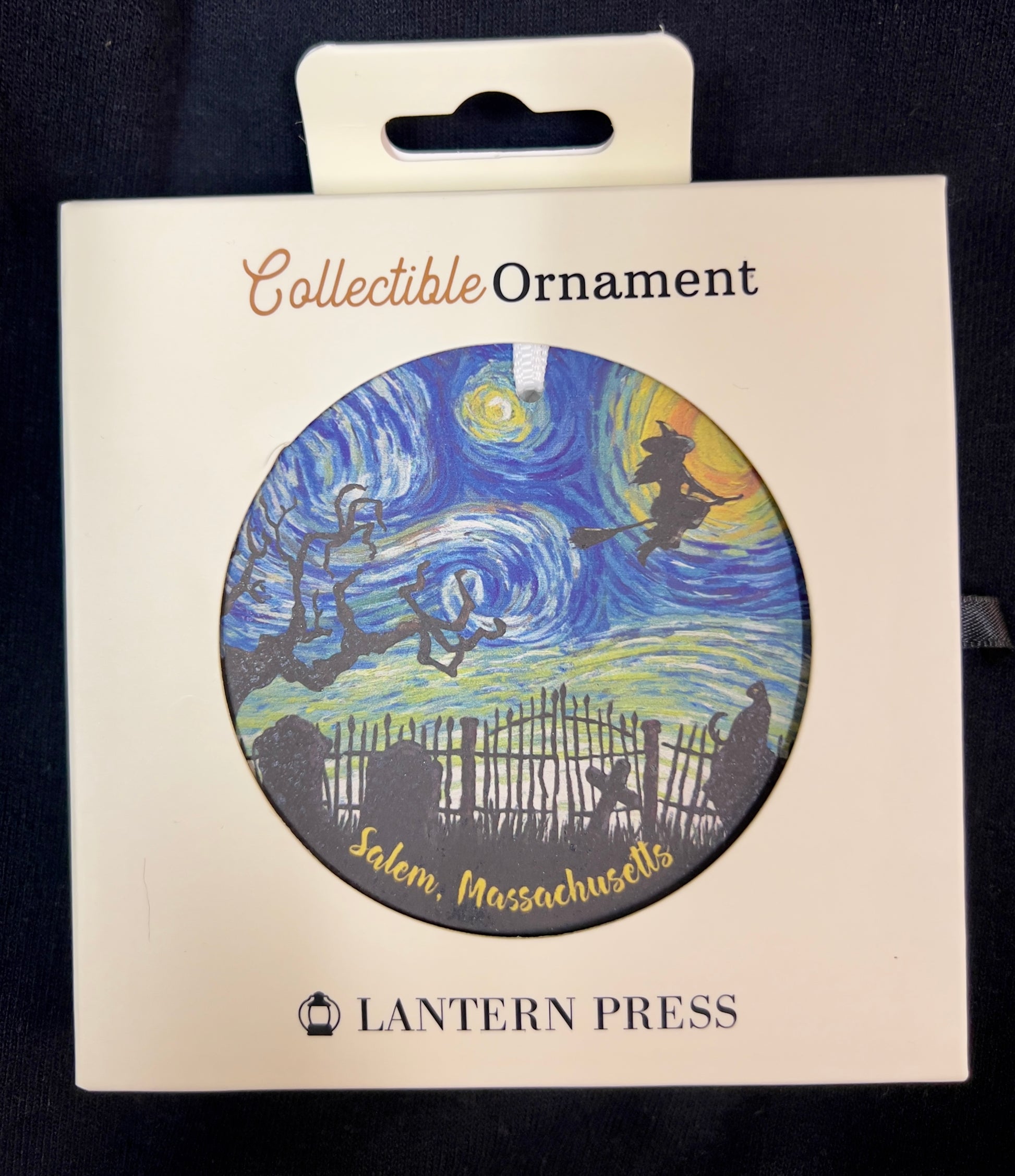 Ceramic ornament is printed on both sides and comes with ribbon for hanging and boxed for easy gift giving. 3" diameter.