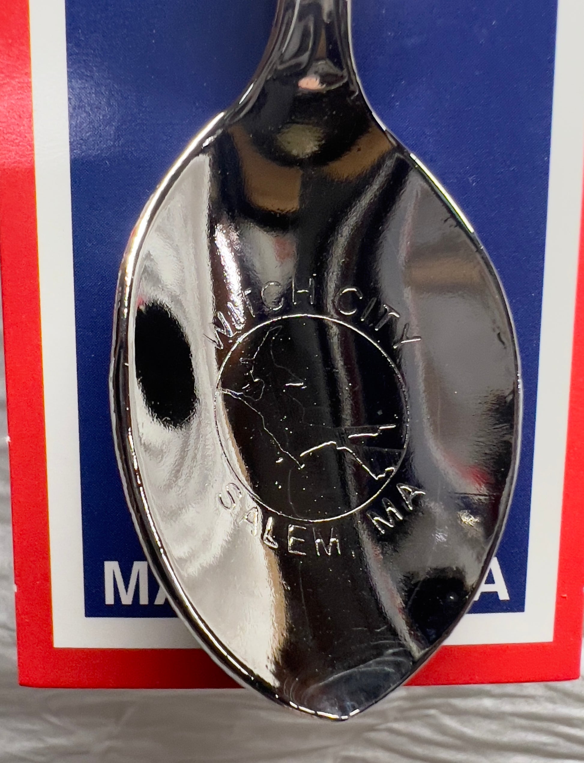 Metal souvenir spoons in a matte or shiny finish. Both have a witch figure on handle top, and etched/stamped bowl. Dull pewter spoon is 4" long and shiny one is 4.5" long.