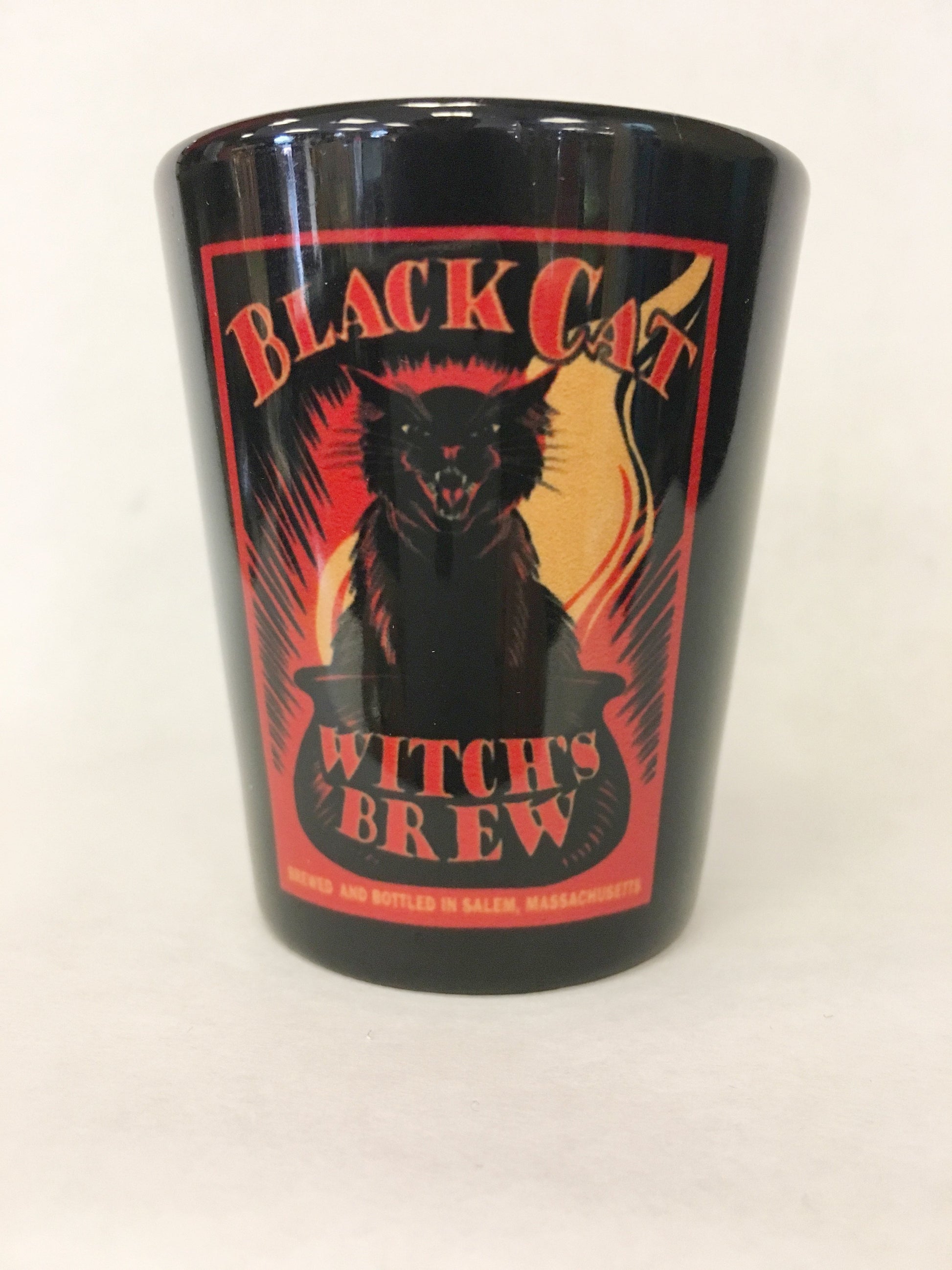 Glossy black ceramic shot glass with wrap around full color design. Scary black cat sitting in a cauldron.