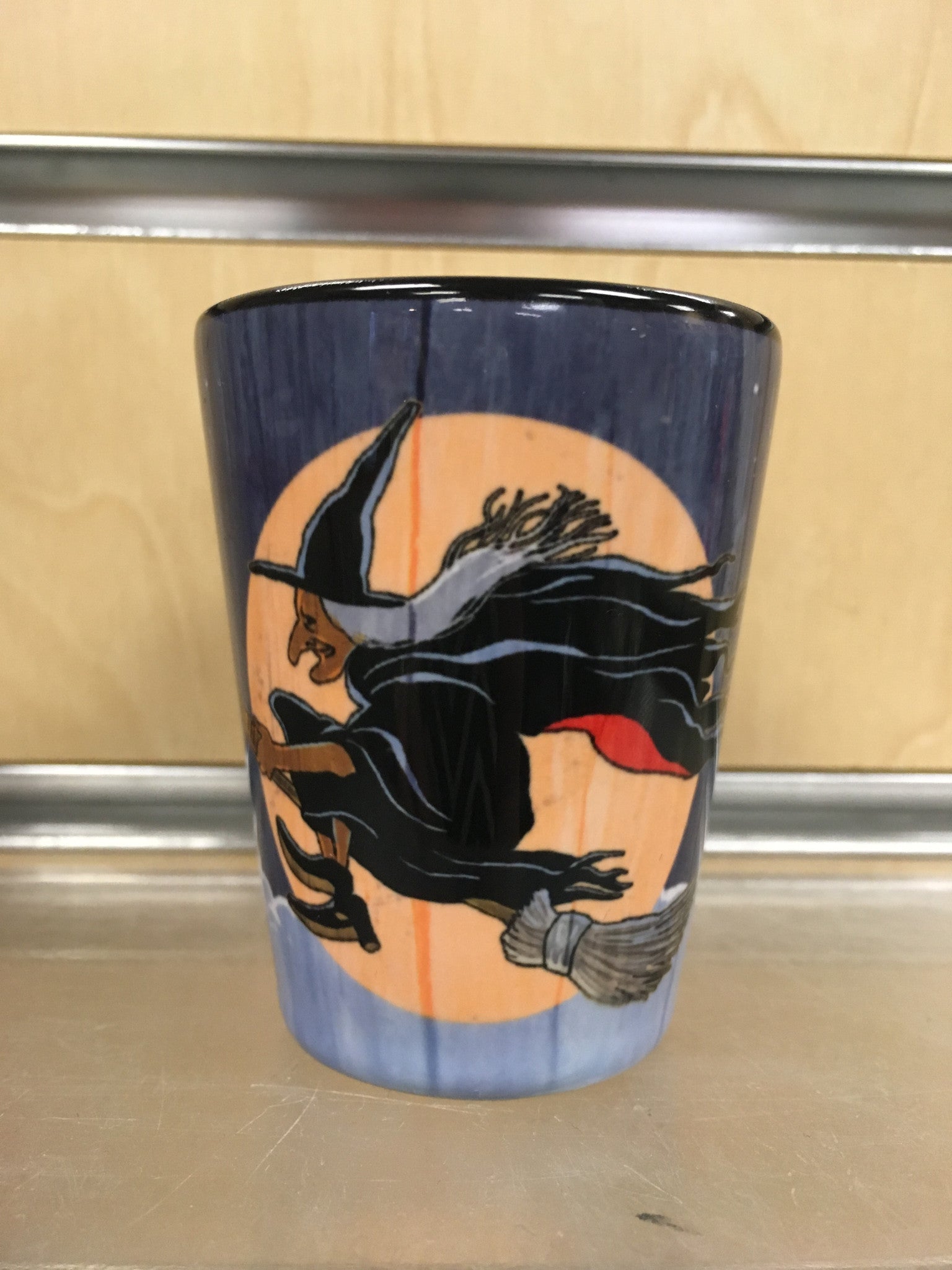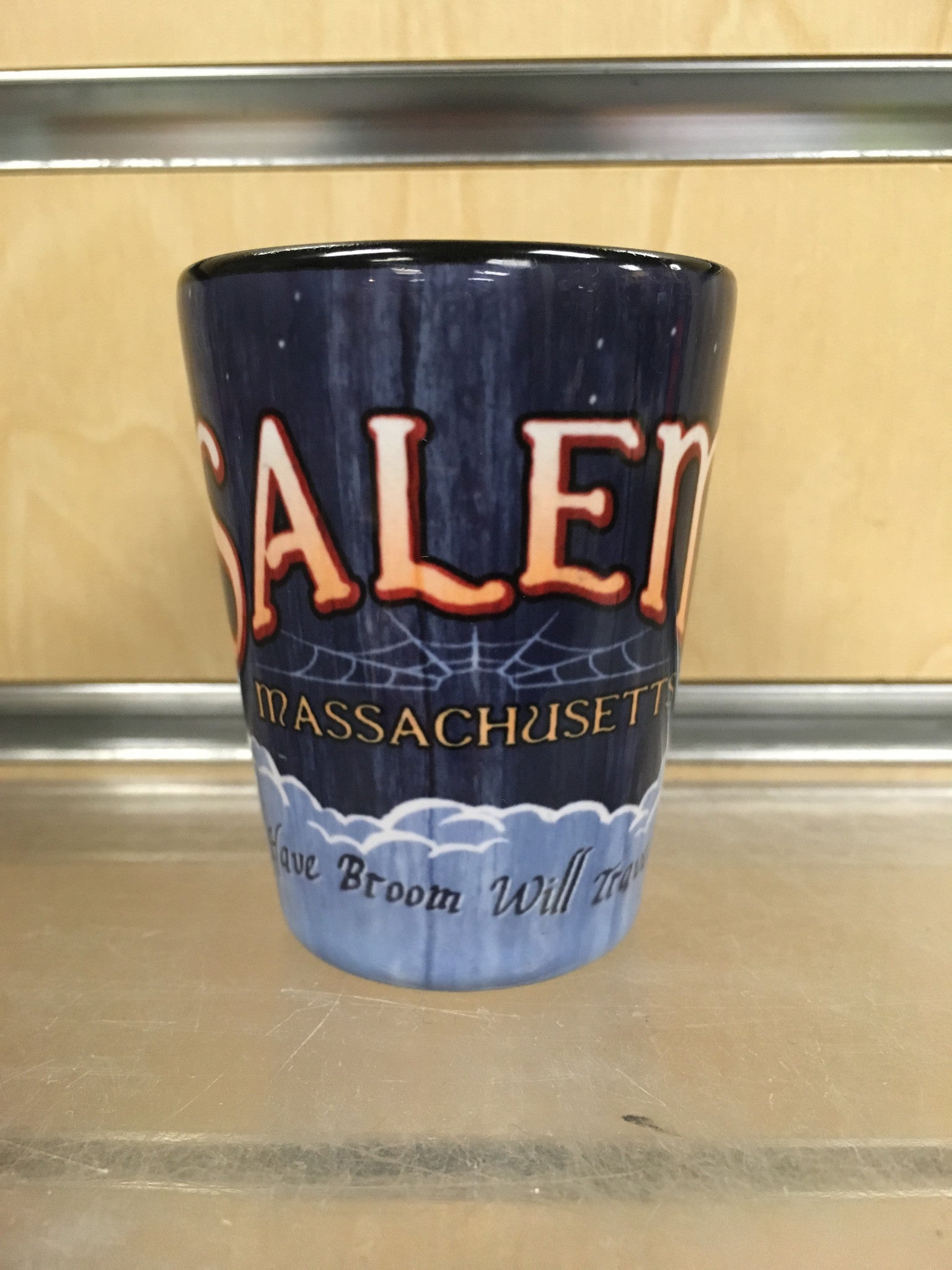 Ceramic shot glass with retro style design. Witch flying across moon, on other side says Salem Massachusetts and "Have Broom Will Travel".