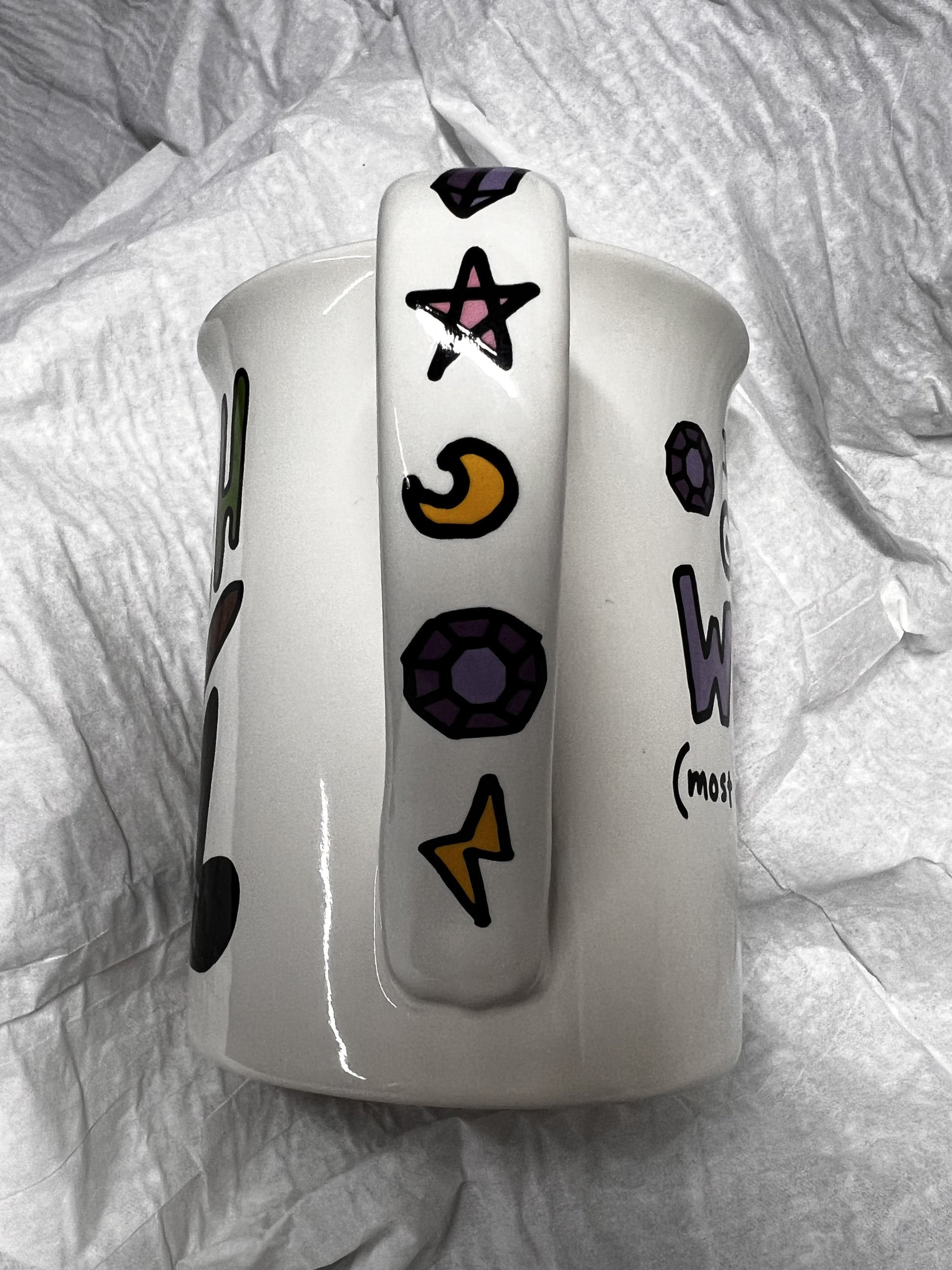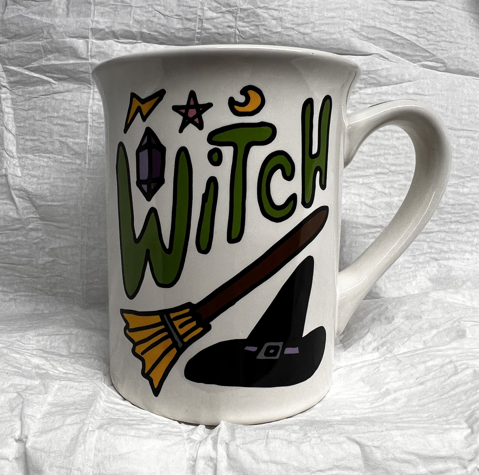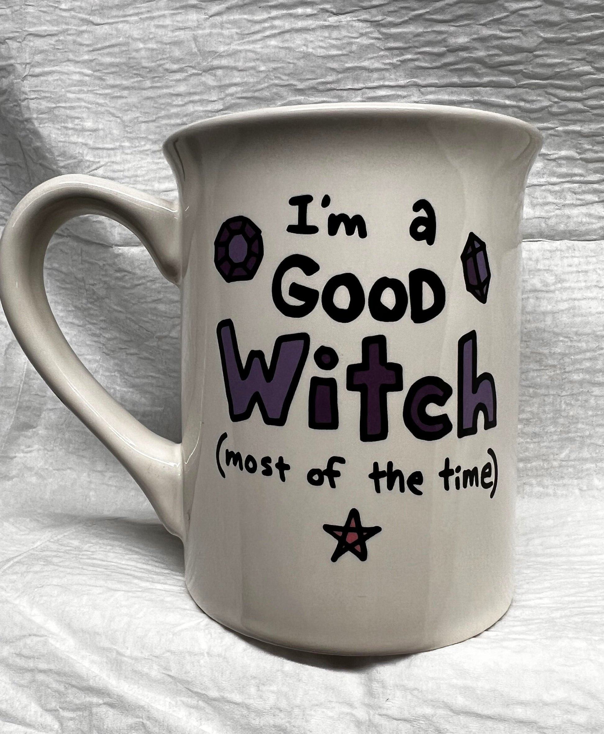 Large white mug with cartoon style illustrations of witchy things and the text "I'm a good witch (most of the time)".